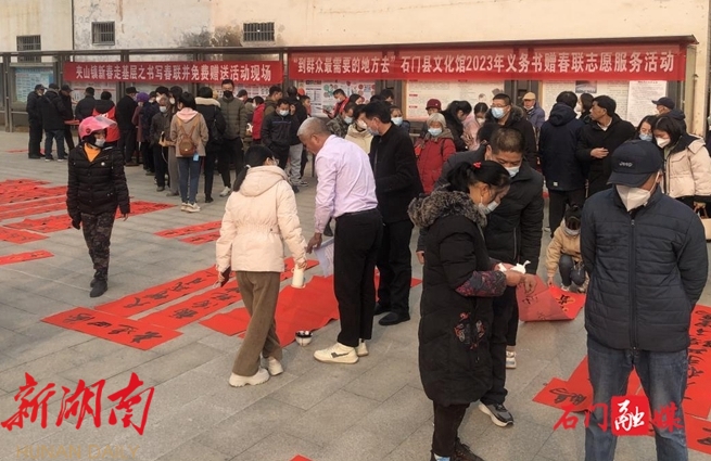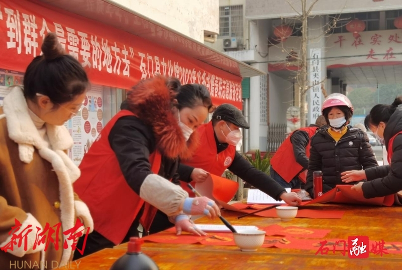 湖南日报·新湖南客户端1月11日讯(通讯员 刘雅筠)为丰富群众精神文化生活,营造欢乐喜庆、温馨和谐的节日氛围,助力新时代文明实践,服务乡村振兴战略,1月10日上午,石门县文化馆志愿服务团队走进夹山镇开展“到群众最需要的地方去”志愿服务活动。本次活动包含两项内容,分别是义务书赠春联和非物质文化遗产展览。