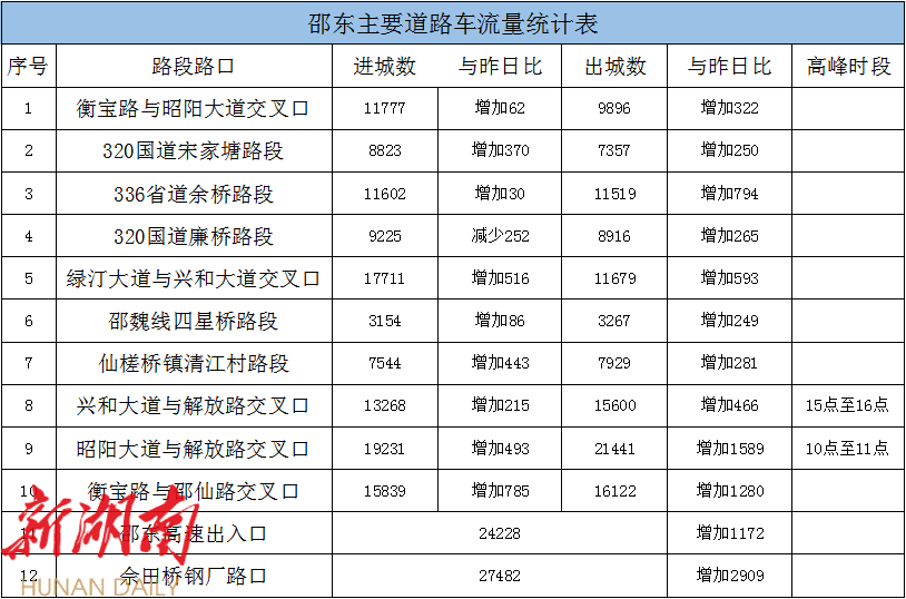 春运期间,邵东市各主要道路车流量大幅增加,交通拥堵时有发生,为方便驾驶员出行,邵东交警每天对辖区主要道路路口的车流量进行统计并公布(统计时间段:先天下午5点至当天下午5点),请广大驾驶员出行时提前做好规划,尽量避开交通高峰时段和路段,确保交通安全顺畅。