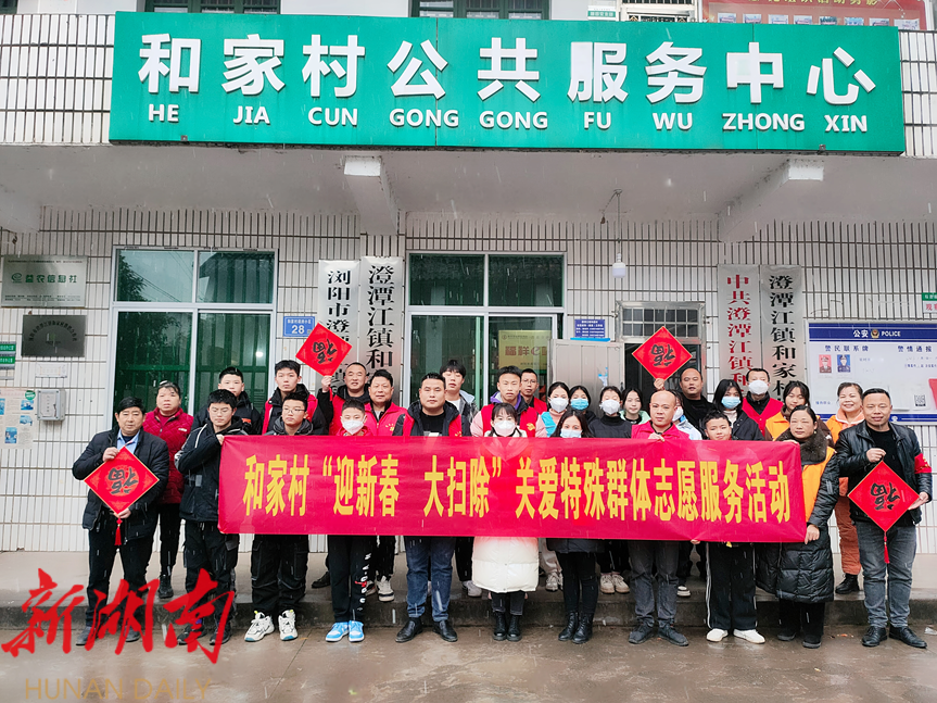 湖南日报·新湖南客户端1月15日讯(通讯员 黎波萍)人间烟火处,年味渐浓时。今天上午,浏阳市澄潭江镇和家村举行“迎新春 大扫除”关爱特殊群体志愿服务活动。党员志愿者、妇联志愿者、小区主任、在村大中小学生等三十余人上门为年弱老人、独居残疾人打扫卫生。