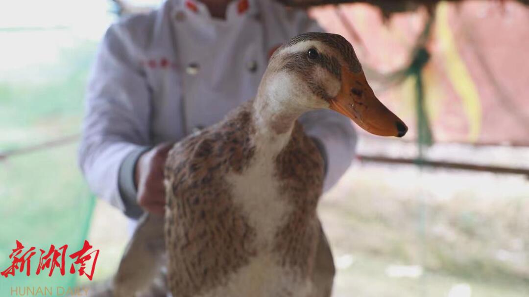 在正和镇朝阳村的养殖场内,一阵阵鸭叫声不绝于耳。一只只体态玲珑的鸭子在青山绿水间嬉戏、觅食,厨师邓星看着水塘里的鸭子,开始寻找今天做桂阳太和鸭的新鲜食材。