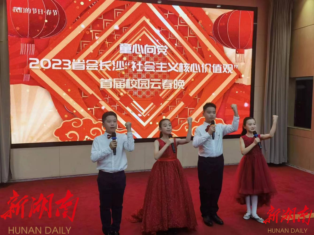 湖南日报•新湖南客户端1月21日讯(记者 张颐佳 通讯员 彭雪华)1月20日,“我们的节日·春节”——长沙校园(云)春晚在长沙市开福区清水塘北辰实验小学举行,晚会以“社会主义核心价值观”为主题,营造了喜庆、欢乐、向上的氛围,展现了新时代好少年“童心向党”锐意进取、健康成长的精神风貌,用文艺的形式推进未成年人思想道德教育和社会主义核心价值观体系建设。