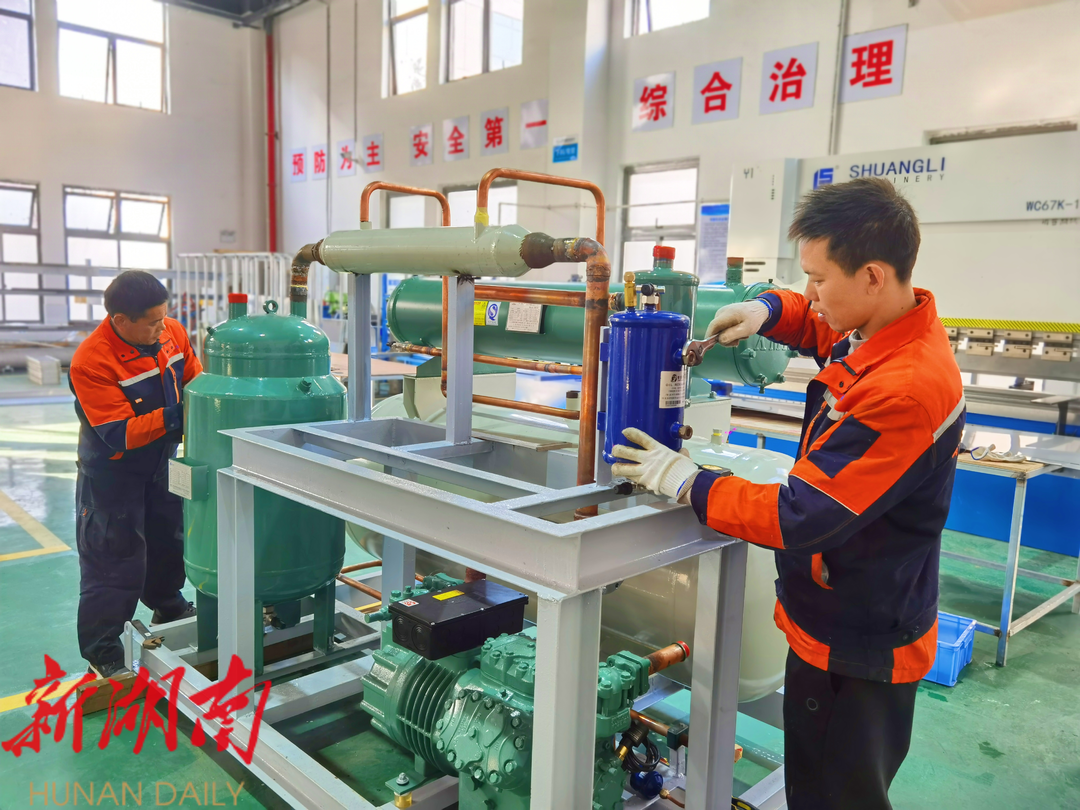 大年初八,位于长沙县泉塘街道泉盛社区未来智汇城内的湖南冰勋制冷设备有限公司,正式开启节后工作模式,喜庆的春联与深咖色的建筑外墙相映成趣,给料峭寒意的春日带来些许暖色。厂区内一片繁忙,工人正在加紧赶制一个即将发往马来西亚的管冰机订单。