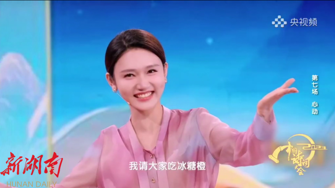 【永兴县融媒体中心2月1日讯】郴籍央视主持人龙洋在主持第七场《2023中国诗词大会》节目现场中与嘉宾们热情互动,她饱含深情,用宋朝著名词人秦观写的“郴江幸自绕郴山,为谁流下潇湘去”,诗意满满地推荐家乡郴州,并诚邀大家品尝永兴冰糖橙。
