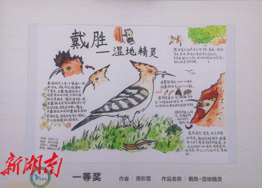 今年年初,松雅湖湿地自然学校发起了“松雅湖杯”湿地自然笔记大赛,长沙市各中小学生积极参加,短时间内收到近百副作品投稿。经评审后,最终评选出了1等奖1名,2等奖2名,3等奖3名,优秀奖10名,入围奖8名。参赛选手通过近距离的观察花草树木、虫鱼鸟兽等湿地自然物,并用图文相配合的方式将美丽湿地记录下来。