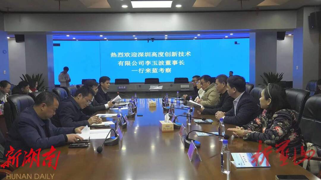 湖南日报•新湖南客户端2月4日讯 (通讯员 王艺淞) 2月3日,深圳高度创新技术有限公司董事长李玉波率考察团来蓝山县产业园区考察,县委副书记、县长邓群,县委副书记、统战部长唐伟文等县领导参加。