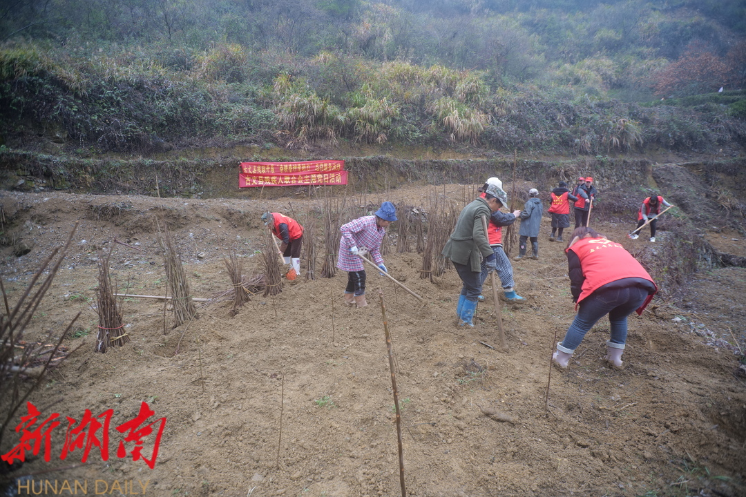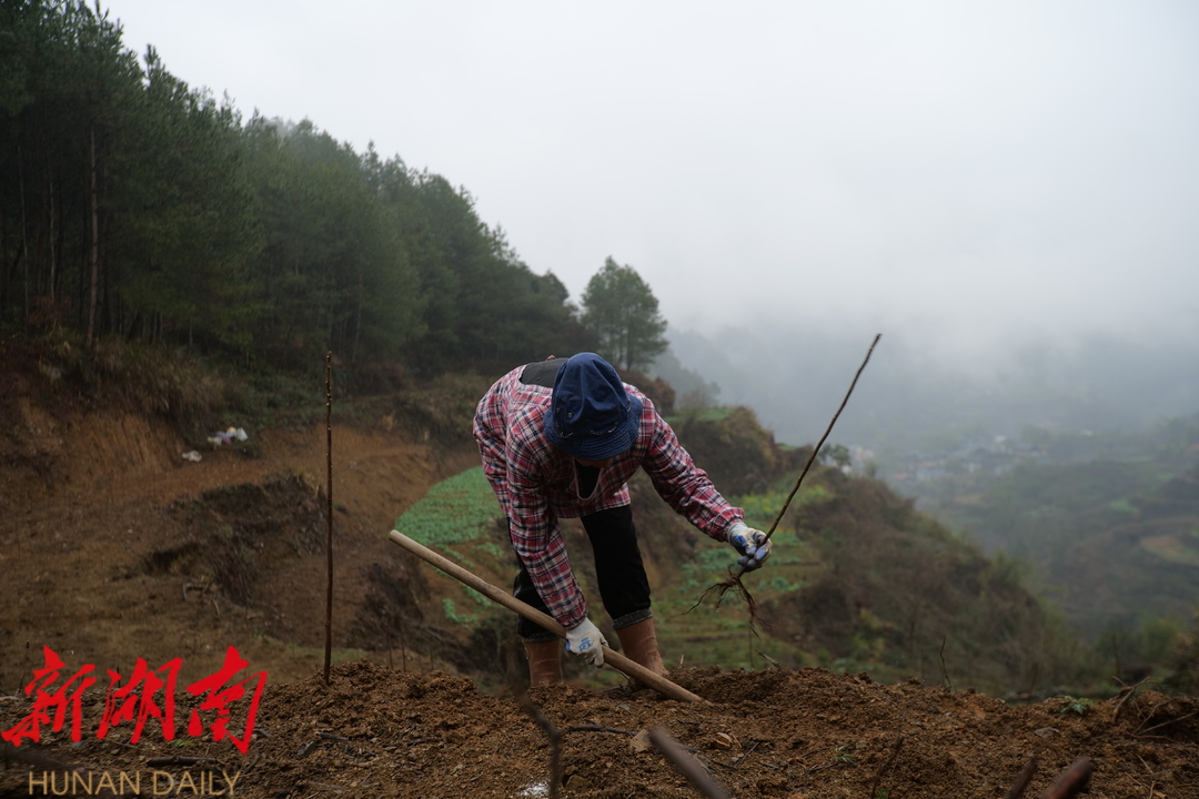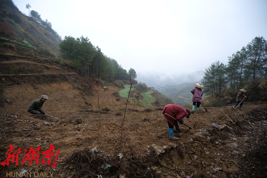 新湖南客户端2月13日讯(记者 鲁南超 通讯员 周迎春)2月11日,春雨蒙眬,湘西土家族苗族自治州古丈县默戎镇盘草村罗其龙与村民们正趁着这一美好时节,充分利用附近新治理开垦出来的近5亩荒山荒地,铆足干劲地挥舞着锄头种植香椿树苗。看着刚栽种下去一排排整齐的香椿树苗,望着即将下大雨的天气,罗其龙虽然有些精疲力尽,但仍然喜上眉梢,憧憬着收获的喜悦。