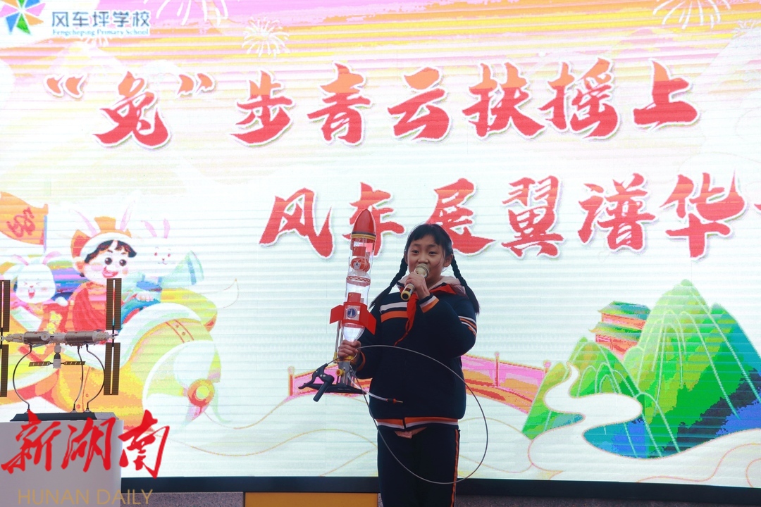 科技点燃梦想,创意成就未来。作为市创新人才培养基地校,风车坪学校致力于培养学生的创新能力,285班学生蒋佳璇的科技创新作品“科技兔”获全国一等奖。开学典礼上,蒋佳璇介绍了学校的航天科技角,点亮了“逐梦灯”,还讲述了制作“水火箭”的过程,把“航天梦”的种子种在了风车少年心中。市优秀讲解员何锦女士从珍藏在韶山的“月壤”引入,讲述了中国航空航天事业的历程,她希望风车少年像科学家一样,脚踏实地、精益求精,像兔子一样仰望星空、低头奔跑,把远大的理想付诸扎扎实实地学习之中。