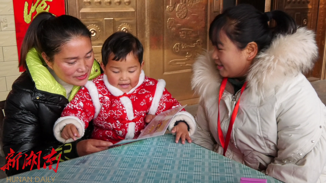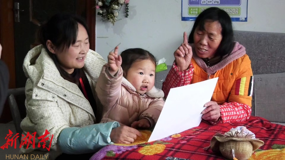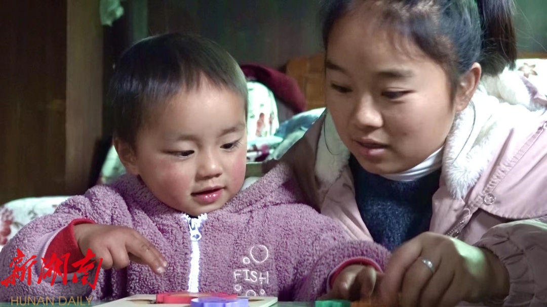 红石林镇先锋村的家访员石仁文介绍:“这些玩具是在妇保站免费领的,今天的这个玩具是能够让孩子对图形有一个认知,增强她的逻辑思维能力,学会拼图。我们每次家访都是先回顾上一周玩的,然后再跟她的监护人玩新一周的玩具。”