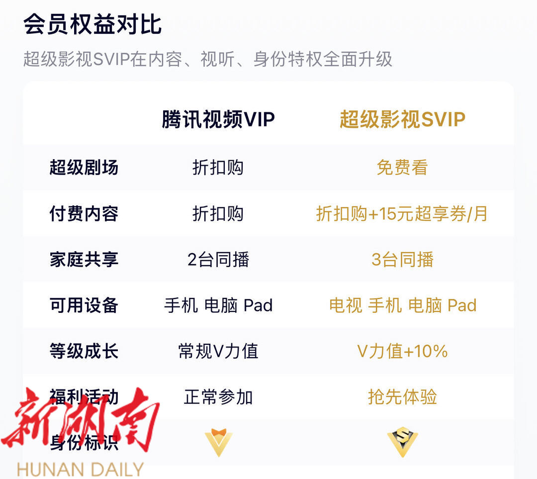 腾讯视频不同的会员权益对比。腾讯视频客户端 截屏图