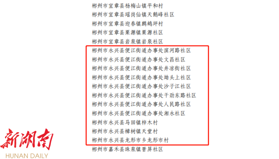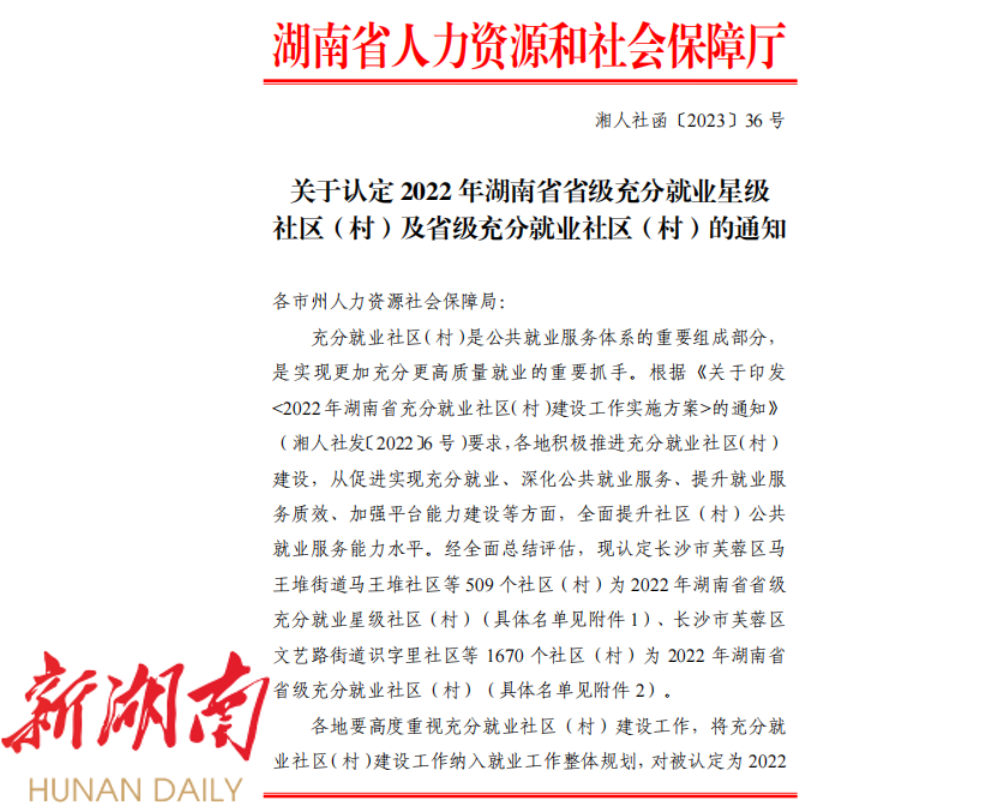 【永兴县融媒体中心2月17日讯】近日,湖南省人社厅印发《关于认定 2022 年湖南省省级充分就业星级社区(村)及省级充分就业社区(村)的通知》,永兴县滨河路社区、文昌社区、井凉街社区、坳头上社区、沙子江社区、干劲东路社区、人民路社区、湘永社区、马田镇梓木村、樟树镇天堂村、龙形市乡龙形市村等11个社区(村)获评湖南省“省级充分就业社区(村)”,其中滨河路社区、文昌社区、沙子江社区、人民路社区、樟树镇天堂村、龙形市乡龙形市村等6个社区(村)荣获湖南省“省级充分就业星级社区(村)”。