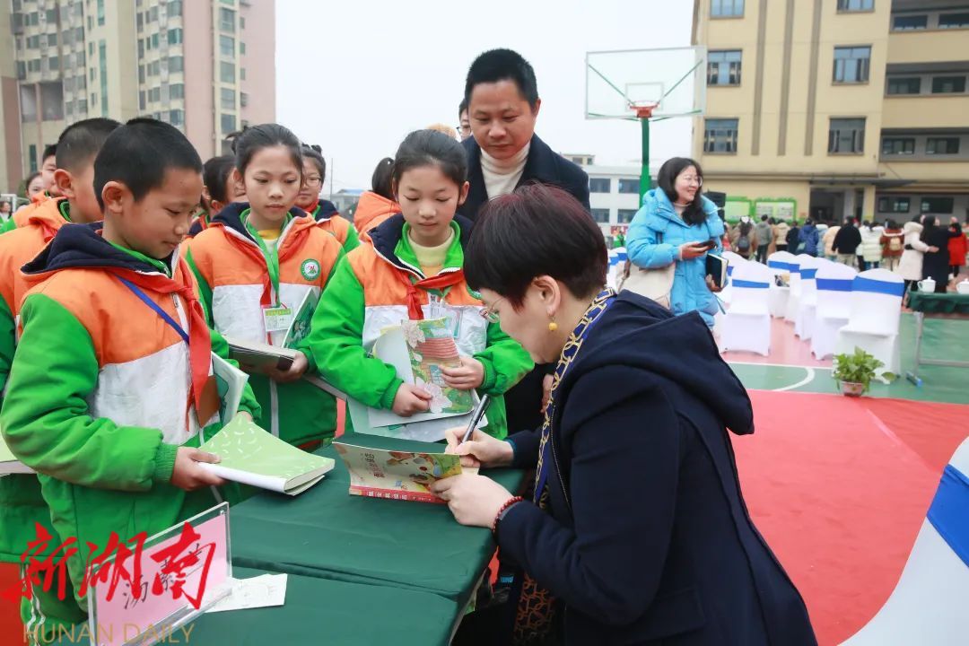玉潭街道新山小学举行2023年春季家长开放日活动暨新学期开学典礼。本次活动旨在通过家校社互动,营造愉悦的开学氛围;搭建才艺大舞台,培养学生的核心素养;邀请作家进校园,坚守学校的阅读特色;创新“小红花”思政课堂,让“新山币”成就大美德。当天,学校邀请儿童文学作家汤素兰老师为学校2022年度优秀“书香家庭”颁奖,并在现场给大家上课,共读《我的家乡十八洞》。活动后,汤素兰为孩子们签名,与孩子们合影。