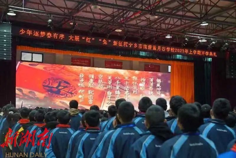 宁乡市南雅蓝月谷学校举行以“少年逐梦春为序 大展‘红’‘兔’新征程”为主题的新学期开学典礼。该校初中部学生齐诵岳飞词《满江红》,意在引导学生落脚到中华诗词,传承精忠报国之爱国情。在小学部开学典礼上,舞蹈《红领巾相约中国梦》、走秀展演《红红的灯笼》等节目精彩纷呈。