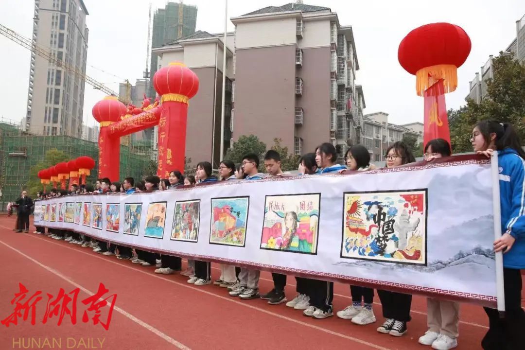 宁乡一中滨江中学全校师生齐聚一堂举行2023年春季开学典礼。典礼上,该校101位学生代表现场绘制主题为“学习贯彻党的二十大精神 丹青绘党恩”的20米长卷,讴歌了今天幸福和谐的美好生活,表达了坚定信念跟党走的决心。学生和青年教师代表通过合唱、朗诵等精心准备的节目,抒发爱党爱国情怀。