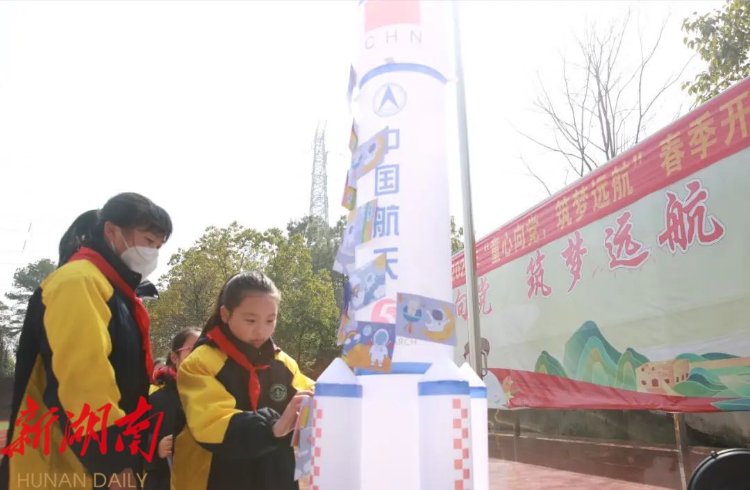 白马桥街道中心小学举行以“童心向党 筑梦远航”为主题的2023年春季开学典礼。在白马“小农场”上播种“大梦想”,希望大家在新的学期,勇往直前,健康成长,快乐学习。各班代表将装有“满满梦想”的信封粘贴在神舟飞船模型上,寓意逐梦远航,精彩一生。