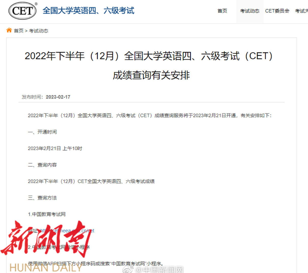 2022年下半年(12月)全国大学英语四、六级考试(CET)成绩查询服务将于2023年2月21日上午10时开通。