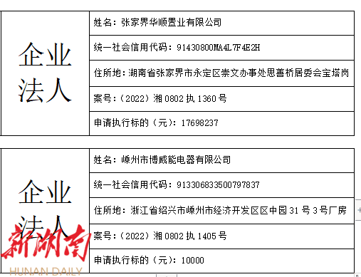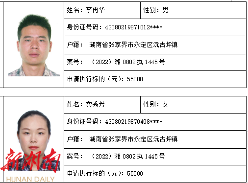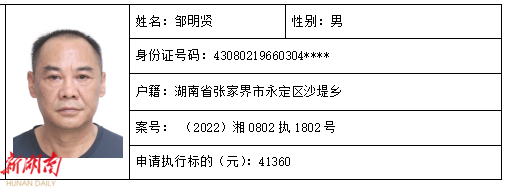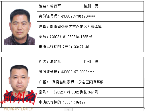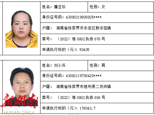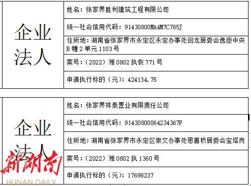 为促使被执行人自觉履行生效法律文书确定的义务,推进社会诚信体系建设,本院根据《中华人民共和国民事诉讼法》、《最高人民法院关于公布失信被执行人名单信息的若干规定》等法律及相关司法解释的规定,现对以下失信被执行人名单信息录入全国法院失信被执行人名单库,并向社会公示。 公告发布后,被执行人履行生效法律文书确定的义务的,本院将及时将其从公布的失信被执行人名单中删除。同时,欢迎其他公民积极提供被执行人可供执行的财产线索。(张家界市永定区法院执行局联系和举报电话:0744-8597273