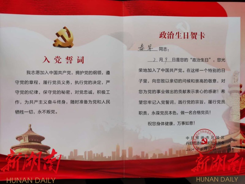 湖南日报·新湖南客户端7月1日讯(通讯员 陈小纤) “秦军同志,7月9日是您的政治生日,您光荣地加入了中国共产党。在这样一个特别的日子里,向您致以亲切的问候和崇高的敬意,对您为党的事业做出的贡献表示衷心的感谢!希望您牢记入党誓词,践行党的宗旨,履行党员职责,永葆党员本色,做一名合格党员!” 7月1日上午,在武陵区丹阳街道机关党支部举办的“政治生日”主题活动中,支部党员秦军等36名党员同志收到了机关党支部赠送的政治生日贺卡。