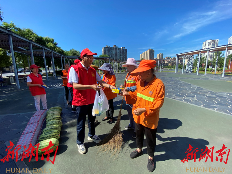 (在职党员为环卫工人送清凉)
