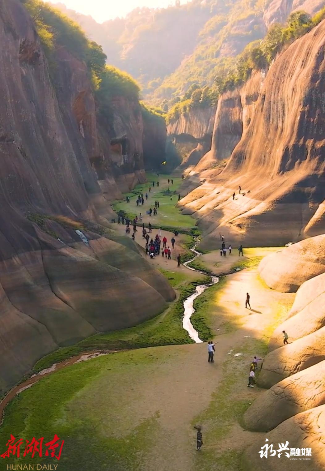 双桥水库位于便江街道茶园村,离永兴县城4公里,离郴州市城区不足40公里,区位优势明显。逢枯水期的双桥水库由于水位下降,露出了它的沟壑纵横的“底”。狭长幽深的丹霞峡谷中,嫩绿的小草钻出地面,为大地铺上厚厚的绿地毯。绿草、红岩、夕阳、蓝天,以及壮观的丹霞地貌,向人们展示着大自然的鬼斧神工,勾勒出一幅五彩斑斓的美丽画卷。水库两侧多为丹霞地貌,景观多为方山,浑园平顶,四壁悬崖陡峭,岩脚陡坡辟有磴道,部分为独立山丘、缓坡。大山山势雄伟,孤山俊秀挺拔。