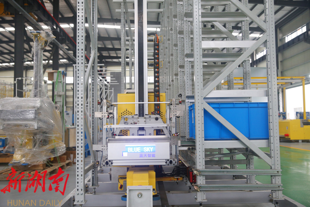 小巧的堆垛机在轨道上快速移动,眨眼间,已将货物放入货架指定位置。厂房里,立体仓傲然挺立,堆垛机、RGV、AGV有序运行,如同灵活的松鼠穿梭在钢铁森林。没有挥汗如雨的装卸工人,只有几名工程师通过数字终端控制着厂内智慧物流高效运行。这是湖南蓝天智能物流装备有限公司(以下简称“蓝天智能”)自主研发生产的厂内智能智慧物流系统运行场景。