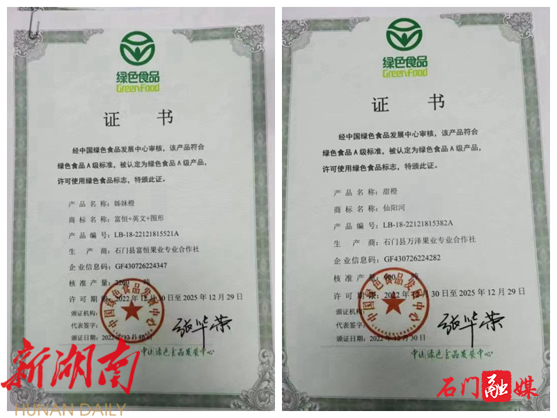 湖南日报·新湖南客户端3月20日讯(通讯员 徐霞)近日,湖南湘佳橘友农业有限公司申报的甜橙产品、石门县万泽果业专业合作社申报的甜橙产品、石门县富恒果业专业合作申报的姊妹橙产品经中国绿色食品发展中心审核,获得中国绿色食品认证。至此,我县获得绿色食品认证企业达到9家,认证面积近8万亩,促进了石门柑橘产业高质量发展。