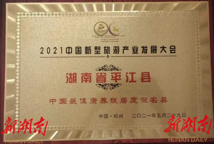 湖南日报 ·新湖南客户端5月30日讯(记者 张璇 通讯员 欧阳武力) 5月29日,在浙江省杭州市举行 的 2021中国新型旅游产业发展大会上,湖南省平江县受邀参加并荣获“中国最佳康养旅居度假名县”称号。