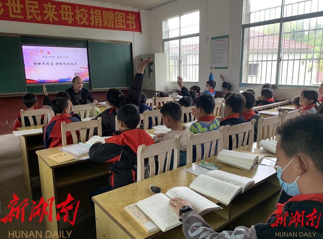 湖南日报·新湖南客户端4月17日讯(通讯员 何九九 傅梦玲)4月15日上午,在第27个世界读书日即将来临之际,平江县文联副主席彭世民来到该县梅仙镇石岭小学,向母校师生捐赠他的新散文集《凤凰花开的路口》。平江县教育局副主任督学徐升平、办公室副主任吴抄金,梅仙学区主任熊准先,原城关镇人大主席彭富强也参加了这次活动。