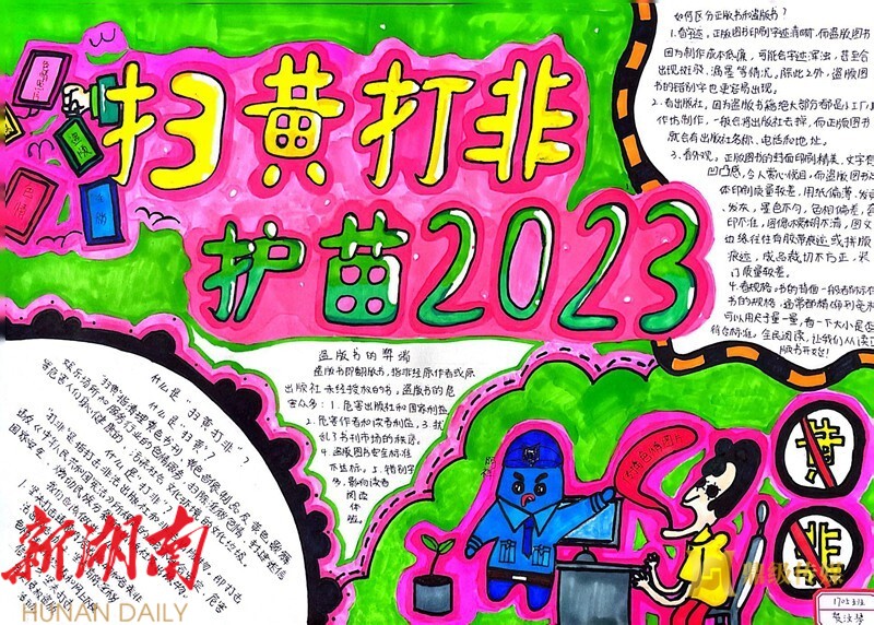 湖南日报·新湖南客户端 3月21日讯(通讯员 蔡照君 ) 为进一步净化校园文化环境,扫除淫秽、色情、暴力等文化垃圾,为 学 校师生营造阳光健康、积极向上的精神家园 ,近日,鼎城区江南小学 举办了“扫黄打非”手抄报 、绘画 评比活动。 全校中、高年级学生 参与了此次活动,活动中共征集作品 90 余份。
