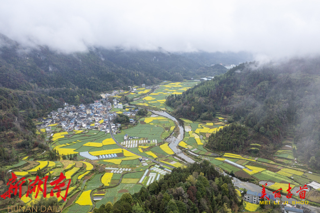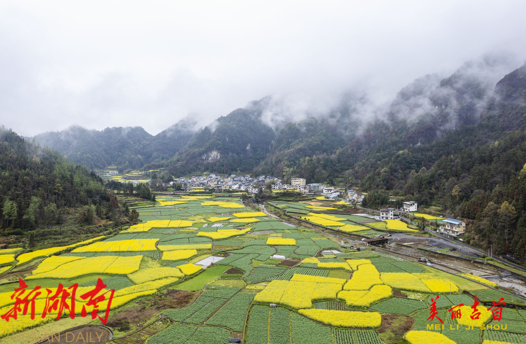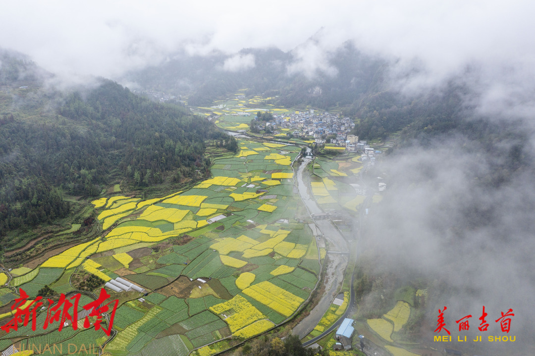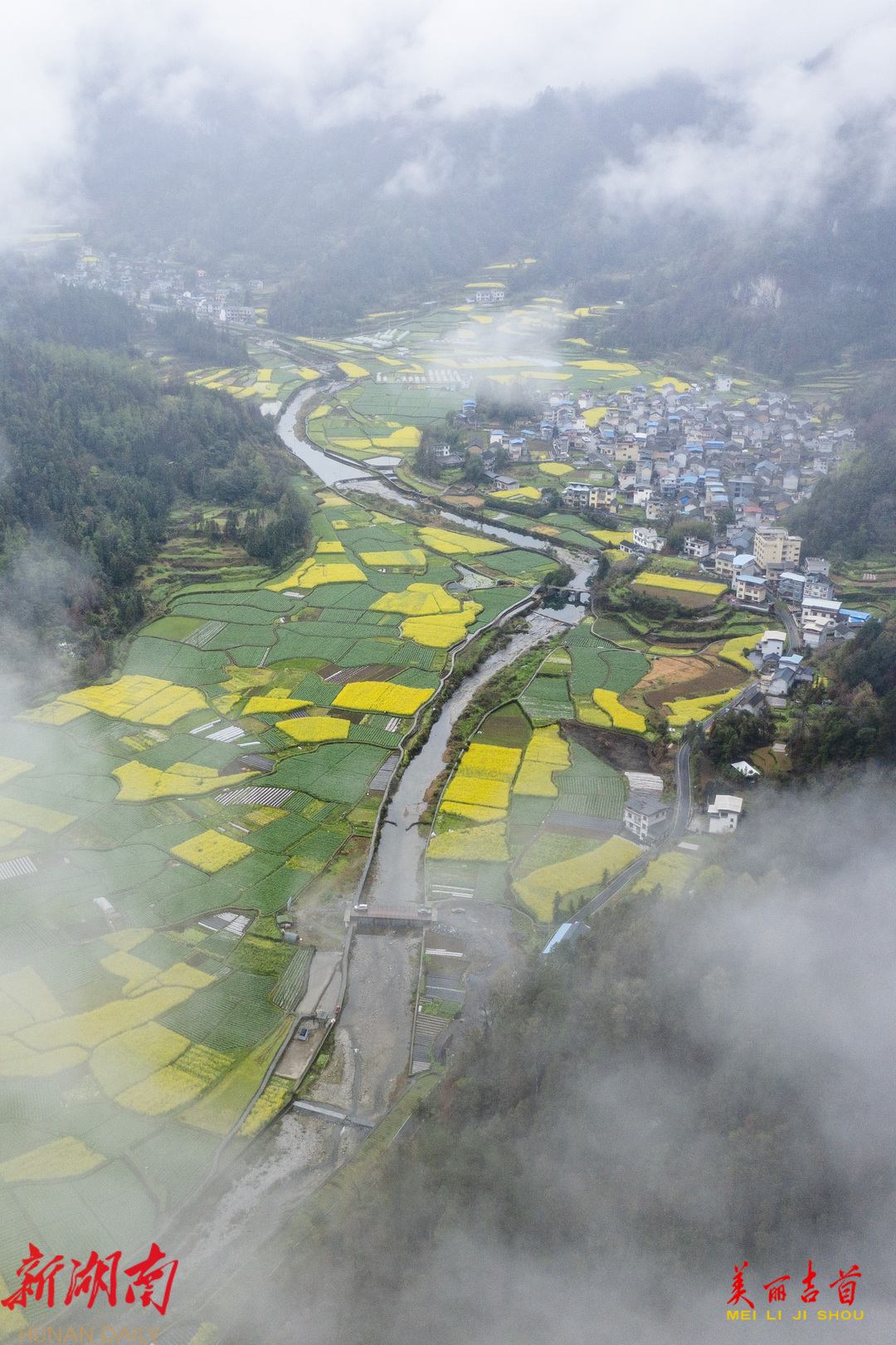 3月21日,雨后的吉首市乾州街道西门口村云雾缭绕,田野、村庄、峡谷、河流若隐若现, 在金色油菜花与绿色马铃薯叶的映衬下,构成了一幅色彩斑斓的春日田园画卷。