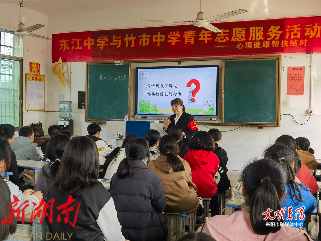 近日,东江中学党总支、团委、学生发展中心携手走进江头中学、竹市中学,开展青年志愿服务暨心理健康帮扶结对活动。李秋娥、罗丽虹几位心理老师针对目前同学们普遍存在的生理健康知识缺失等问题,从女生青春期性教育谈起,就女生青春期心理变化、早恋的危害、如何与异性朋友正确相处、如何预防性侵害等方面展开。引导学生学会关爱自己,保护自己,远离伤害。