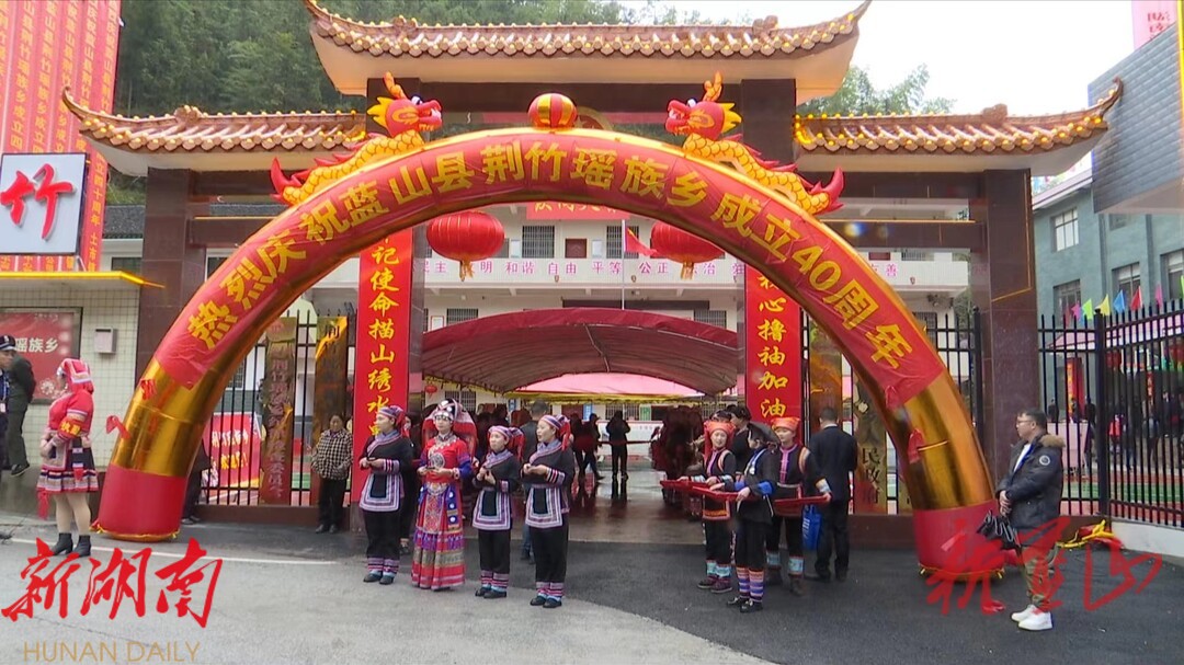 (通讯员 李季 彭耀民 杨涛)3月28日,蓝山县荆竹瑶族乡举行建乡40周年庆典活动,省市县祝贺团前往祝贺,分别向荆竹瑶族乡赠送贺匾,100余名瑶族群众欢聚一堂,共同见证该乡40年以来取得的辉煌成绩。省民宗委宗教一处一级调研员朱朝晖,市人民政府党组成员、副市长吴恢才,县委常委、县人武部政委邓海勇等出席并讲话。