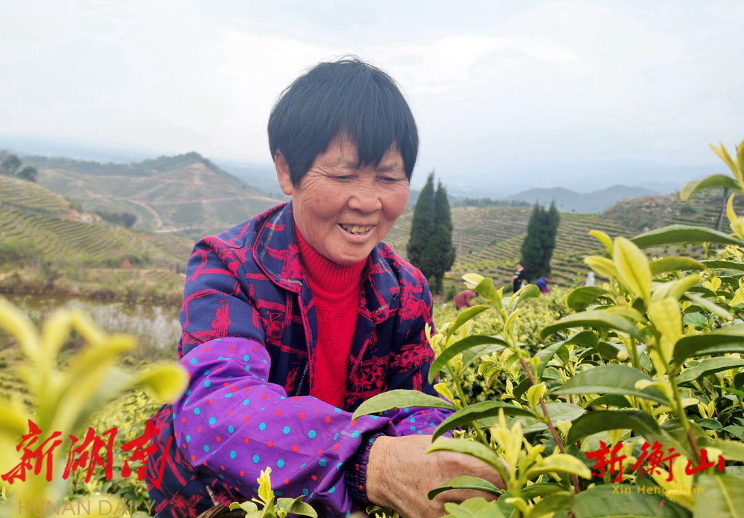 福田铺乡云峰村的汤菊英今年70岁。每年这个时候,她都会和村里人结伴同行,跨乡镇来到衡山皇茶文化园采摘茶叶,每天现摘现称现结,一个多月能挣上两三千块钱。