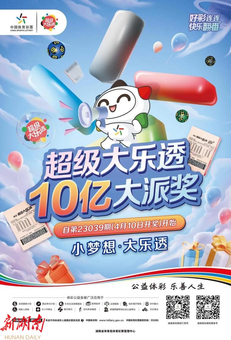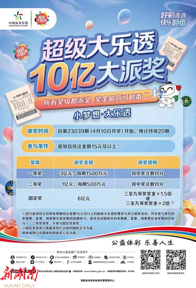 2023 年4月3日,国家体育总局体育彩票管理中心发布《关于开展2023年超级大乐透派奖活动的公告》。根据公告,2023年超级大乐透10亿大派奖活动将于超级大乐透第23039期(2023年4月8日21:10开售,4月10日开奖)开始,预计持续20期,派奖总额高达10亿元!