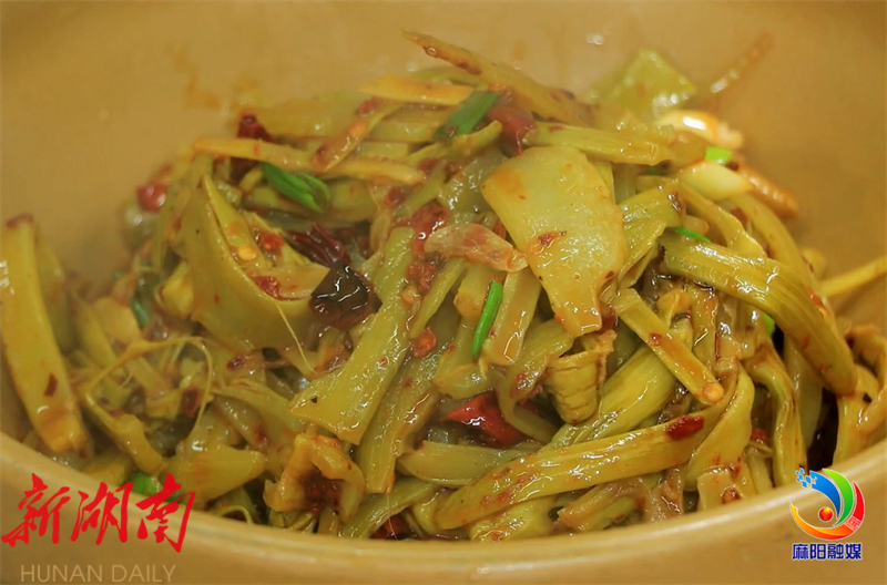 在麻阳,酸关藤是一种生长在山谷溪边、田边的植物,酸关藤又名虎杖,对治疗湿热、风湿、咳嗽、跌打损伤有一定的功效,每年清明前后的10来天最为脆嫩。它被苗乡群众采来、洗净、剥皮、清泡、爆炒,做成一道苗乡特色美食。