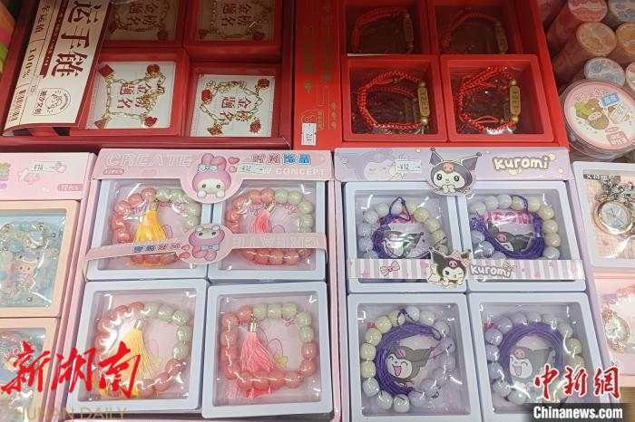 在一家文具店内,商家将标价为12元的“精品菩提流苏手链”摆在了店内最显眼的位置。店主向中新财经表示,由于近期不少学生喜欢盘串,自己才特意进了货。