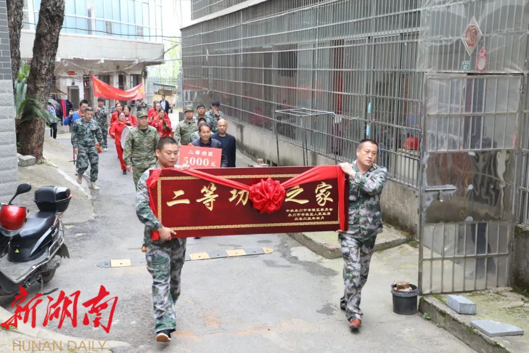 湖南日报·新湖南客户端4月13日讯(记者 陈涛)4月11日,永州市零陵区柳子街社区锣鼓喧天,军地工作人员抬着“二等功臣之家”牌匾来到现役军人高爽家中。这是继2月下旬现役军人陶军勇荣立二等功,零陵籍现役军人再度获此殊荣。