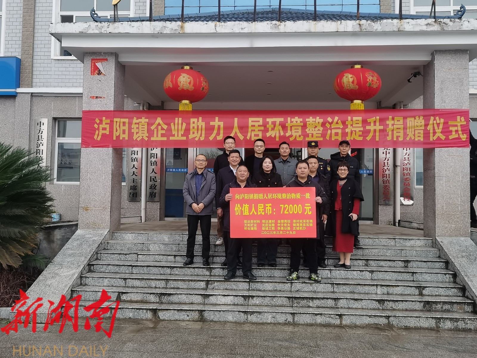 中方融媒4月13日讯 乡村振兴聚合力,爱心企业共担当。近日,中方县泸阳镇举行企业助力人居环境整治提升捐赠仪式。辖区内18家企业捐赠价值72000元人居环境物质, 有效缓解了泸阳镇环卫基础设施不足的问题,有力促进了多方共建、繁荣泸阳的平台搭建。 市乡贤、企业代表李军表示:“企业应该承担社会责任,在征求群众意见基础上,我们18家企业负责人自发捐赠垃圾桶及消防设施一批,解决当前急需,我们也将继续关注群众所需,尽企业最大能力助推宜居泸阳建设”。