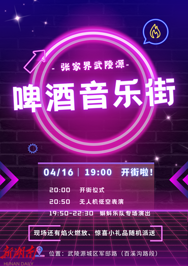 湖南日报·新湖南客户端 4月14日讯(记者 覃蕾)它来了,它来了!4月16日晚7时,武陵源啤酒音乐街终于迎来开街,来这里,开启逛吃溜娃深夜食堂新模式 !