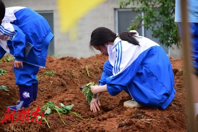 在永州九中校内,有一个劳动实践基地位于校园东北角,以班级为单位组织同学们对基地的“责任田”进行“承包”,分模块种植时令作物。
