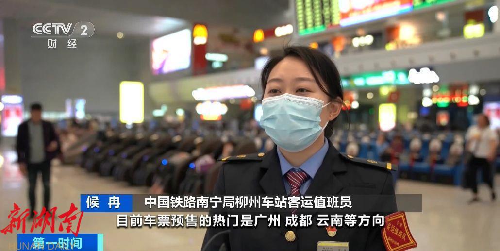 中国铁路南宁局柳州车站客运值班员 候冉:目前车票预售的热门是广州、成都、云南等方向。预计整个五一假期,柳州站增加南宁、贺州等方向6趟车。