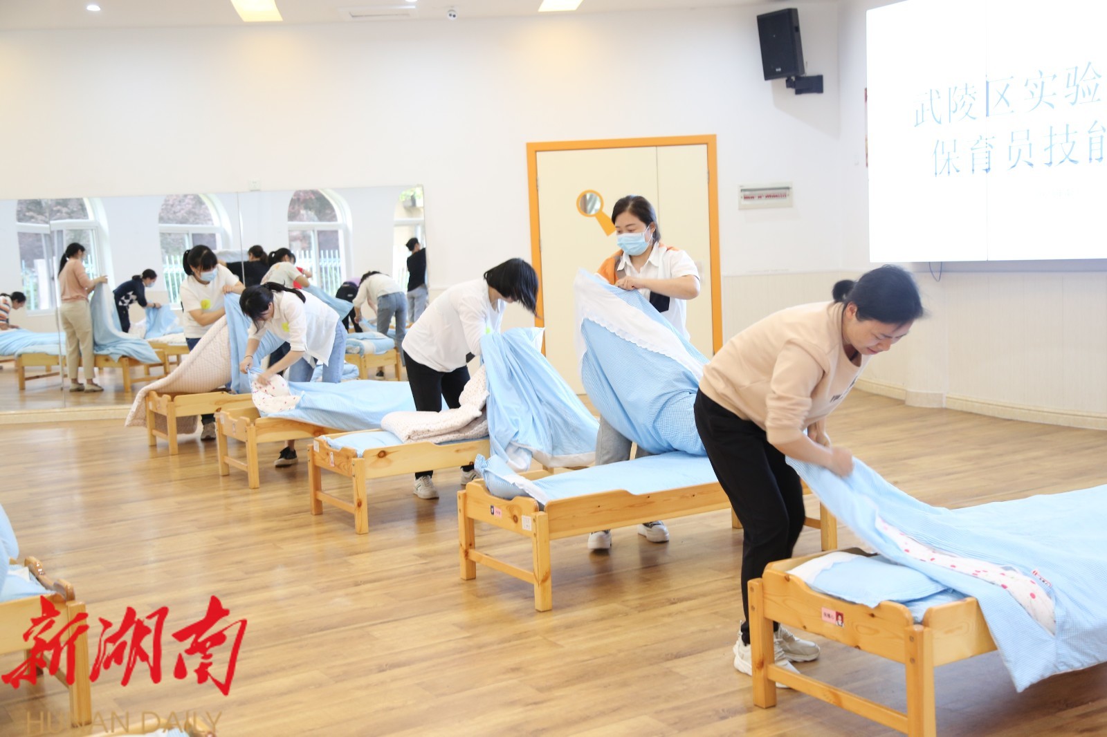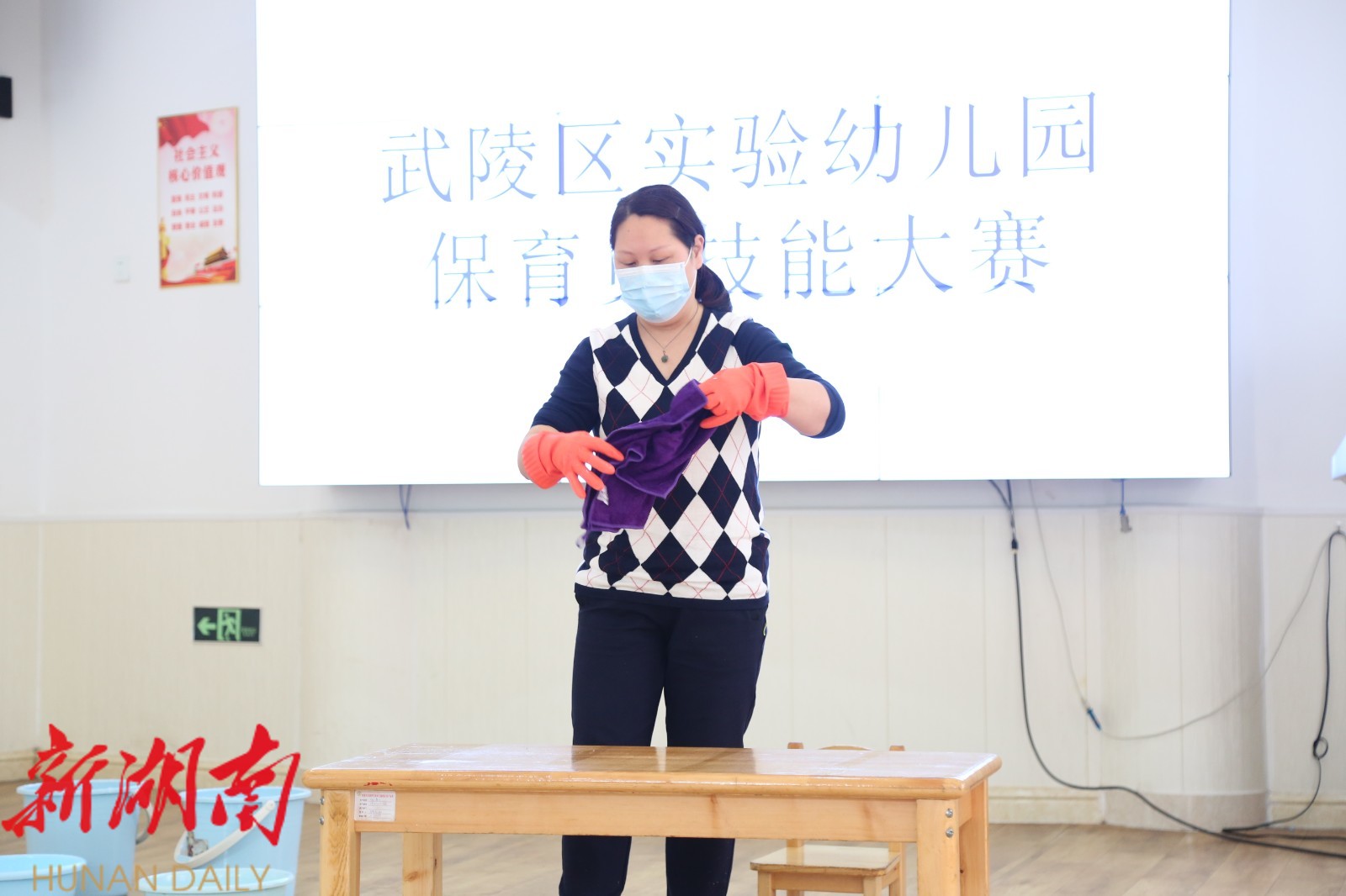 为进一步提高幼儿园保育实操技能,使保育工作细致化、规范化、科学化,真正做到“保教结合,教养并重”,武陵区实验幼儿园成功举办2023年保育员技能大赛,此次大赛分为桌椅消毒、床铺整理和海姆立克急救法三大部分。