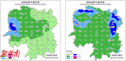 23 日 ,岳阳、长沙、湘潭、株洲、衡阳、永州阴天有小到中等阵雨或雷阵雨,部分地区大雨,其中平江、浏阳、株洲市区、醴陵、攸县暴雨,其他地区阴天间多云有阵雨或雷阵雨(图2左);北风3~4级;最高气温湘南14~16℃,其他地区12~14℃;最低气温湘西、湘北7~9℃,其他地区10~12℃。