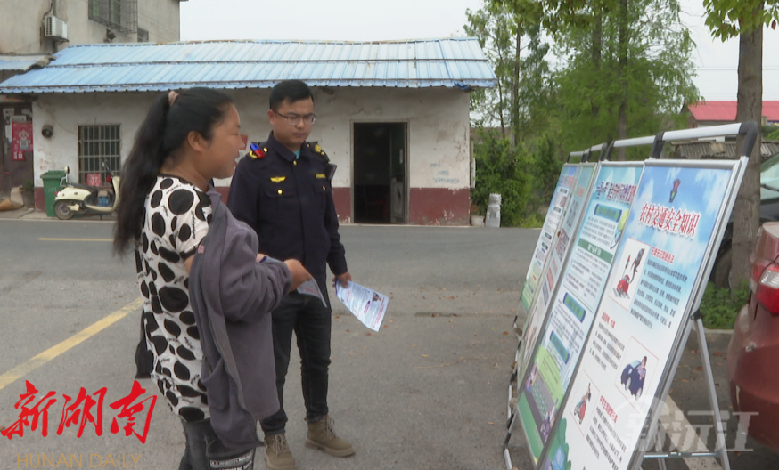在泗湖山镇北港村,执法人员将一位驾驶着电动车的村民拦了下来,对村民未佩戴头盔的行为进行教育劝导,同时将驾驶人带到安全出行知识展示牌前,为其讲解了佩戴头盔的重要性,告知其佩戴安全头盔可以降低交通事故死亡率,骑乘电动自行车时佩戴安全头盔是对生命安全的有效保障等知识。