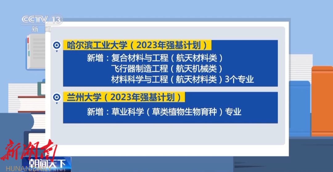 围绕服务国家战略,今年,部分试点高校强基计划的招生专业有所调整。哈尔滨工业大学新增:复合材料与工程(航天材料类)、飞行器制造工程(航天机械类)、材料科学与工程(航天材料类)3个专业。兰州大学新增:草业科学(草类植物生物育种)专业。