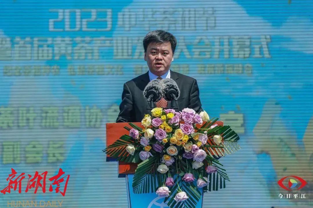 中国工程院院士、湖南农业大学学术委员会主任刘仲华在开幕式上推介岳阳(平江)黄茶并宣布2023中华茶祖节暨首届黄茶产业发展大会开幕。中国茶叶流通协会副会长梅宇,湖南省供销合作总社党组成员、理事会副主任张军,岳阳市委副书记、政法委书记汪涛,平江县委书记李勇都在大会上致辞。