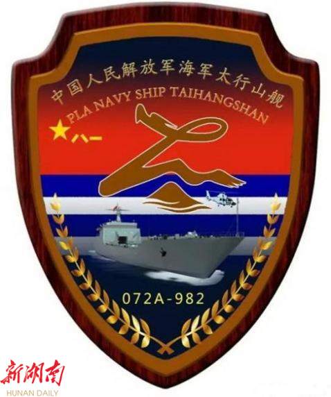 舰徽图案要素包括海军旗、海军军种标识、世界地图、橄榄枝、长城;
