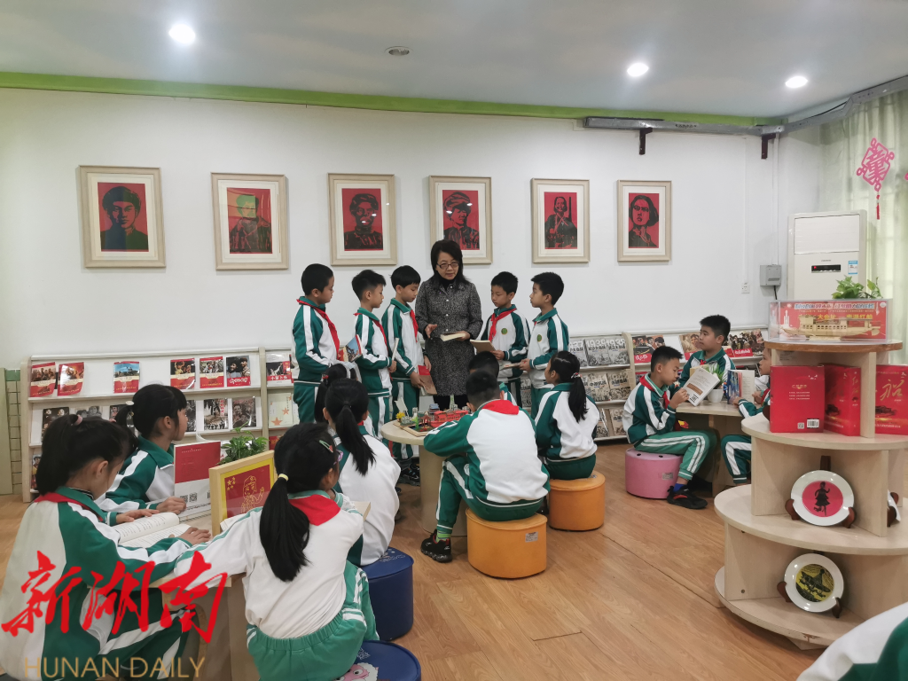 广州市花都区骏威小学校长杨秀红在带领学生进行“红色阅读”。(黄小宇 摄)