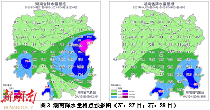 28 日 ,湘中、湘南阴天有中到大雨,衡阳南部、永州南部、郴州东部局地暴雨,其他地区阴天有阵雨或雷阵雨(图3右);雷雨时阵风7~8级。