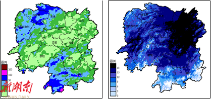 上周(4月17日至23日)省内气温起伏大,17日晚至18日、21日至23日出现两次降雨过程,并伴有风雹等强对流天气。17日晚至18日 全省平均降水量41.7毫米,强降雨集中在长沙、湘潭、株洲、娄底、怀化中部、湘西州、永州中北部、岳阳南部等地,其中望城区、浏阳、祁东、衡南、衡东等23个县市区105站累计雨量超过100毫米,最大为浏阳张坊镇157.6毫米,最大小时雨强为新田莲花乡90.8毫米(19日00时至01时);郴州、衡阳、株洲、岳阳、益阳、湘西州、长沙等地33个县市区56站出现8级以上大风,最大为郴州北湖区仰天湖乡屋场坪站24.9米/秒(10级,19日04时58分);汨罗、湘阴、南县、湘潭县、衡东、祁东、新晃、桂阳、嘉禾、渌口区等11个县市区出现冰雹。21日至23日 出现一次较强降雨、强降温大风天气过程,较暴雨主要出现在湘西州、张家界、常德、永州、郴州等地,其中永州市区、江华、江永、宁远、道县、新田、郴州市区8个县市区20站累计雨量超过100毫米,最大为江华码市137.7毫米,最大小时雨强为新田黄家舍小学站93.1毫米(21日20时至21时)(图1左);永州、郴州等地共23个县市区33站出现8级以上大风,最大为郴州站24.4米/秒(9级,21日19时40分),桂阳等地出现冰雹;过程伴有强烈降,截至23日20时,常德、岳阳、长沙、湘潭等28个县市区最高气温降幅超过20℃,常德市武陵区降幅最大达22.4℃(图1右)。另外,20日早晨湘中、湘北大部分地区出现大雾。