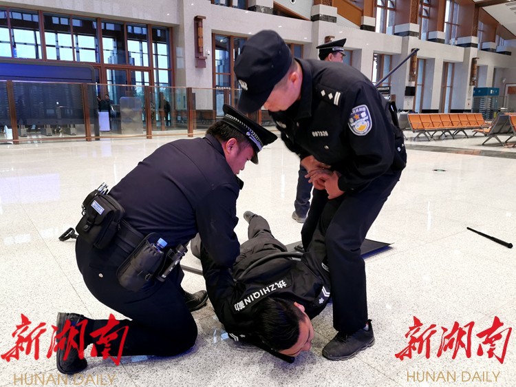 新湖南客户端1月2日讯(通讯员 王旭)一名不明身份的“暴恐分子”带着刀具经过安检,被安检工作人员查获,随后持刀在候车室内砍杀群众,造成群众恐慌。接到车站执勤特保报警后,民警迅速启动反恐防暴处置预案,经过一番激烈“搏斗”,“暴恐分子”被民警控制并带离现场……